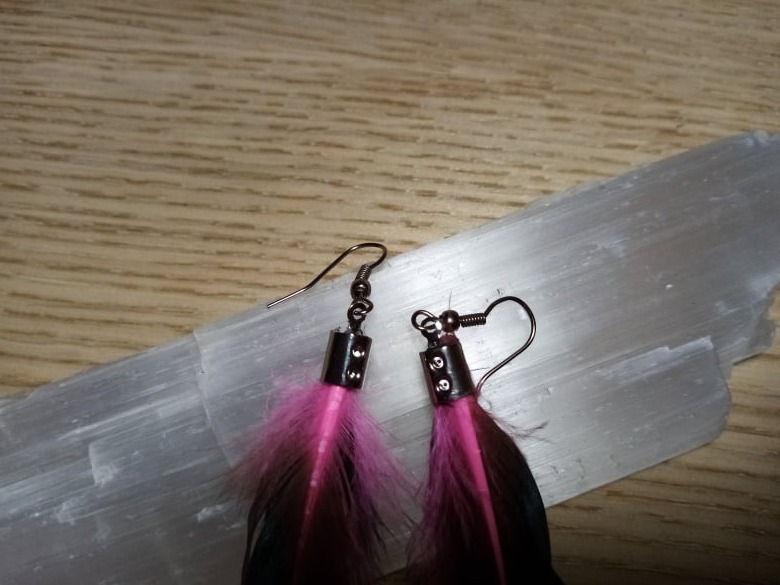 Brinco pena metade rosa e a outra metade preto com uns laivos de azul esverdeado brilhante.